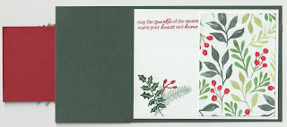 Layer the 2-1/4 x 3-3/4 DSP onto the 2-1/2 x 4 Basic White for the left side of Evening Evergreen card base front. The score line/fold should be next to this